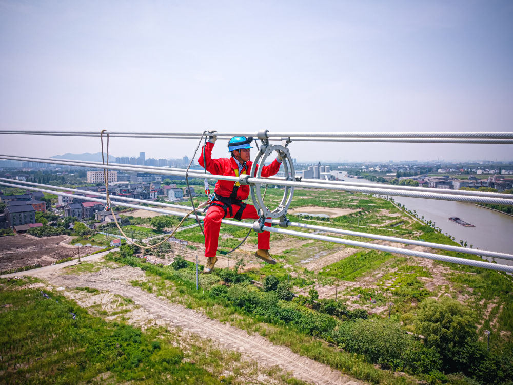 12日上午10时,在浙江杭州和湖州交界处的京杭大运河边,气温已达37摄氏度,浙江省送变电工程有限公司员工吴国伟正准备进行当天上午最后一档特高压导线的走线验收工作。