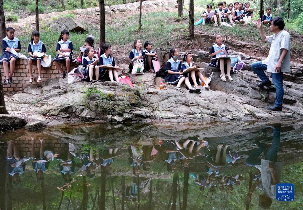 在“洛阳三彩陶艺村”,郭爱和带领罗岭乡中心小学的学生写生(7月12日摄)。新华社记者 李安 摄