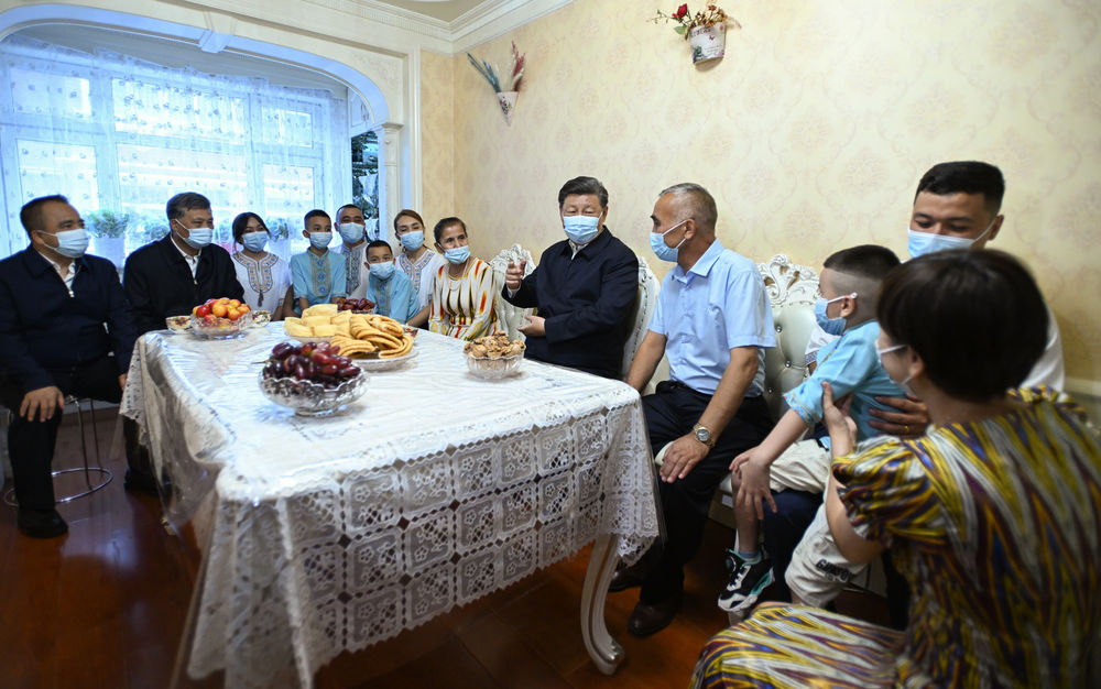 这是7月13日上午,习近平在乌鲁木齐市天山区固原巷社区,同维吾尔族居民阿布来提·吐尔逊一家人围坐在一起拉家常。