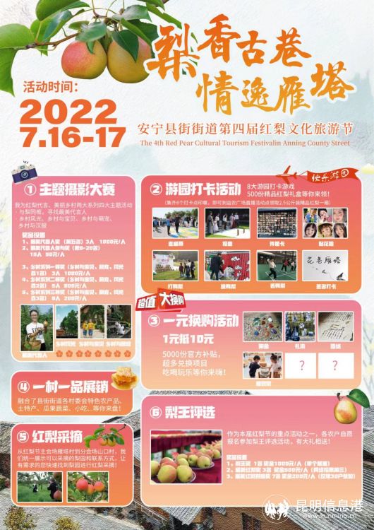 7月16日启幕的安宁市县街街道第四届红梨文化旅游节暨苗族村太阳冲花山节,吸引了数百名游客汇聚主会场花巷雁塔、分会场太阳冲村和山口村,嗨玩各类特色项目,品尝多种特色美食,度过愉快周末。活动现场共引入包括餐饮、休闲娱乐、服务、体验类在内的4种业态,各类主题活动10余个,商家总数达50余家。期间也将举办梨王评选活动等。