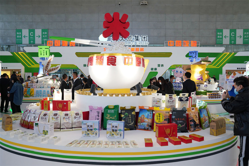 在第三届中国·黑龙江国际大米节现场,参观者在北大荒集团展区了解情况(2020年10月19日摄)。新华社记者 王建威 摄