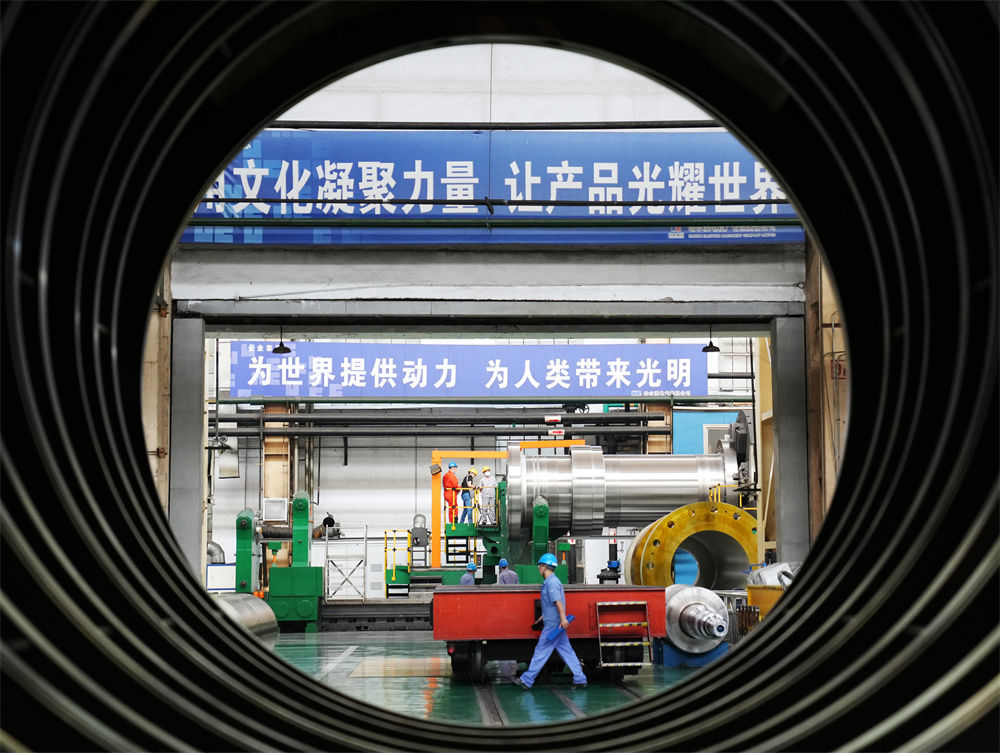 在哈电集团哈尔滨电机厂有限责任公司车间,工人进行生产作业(2022年6月27日摄)。新华社记者 王建威 摄