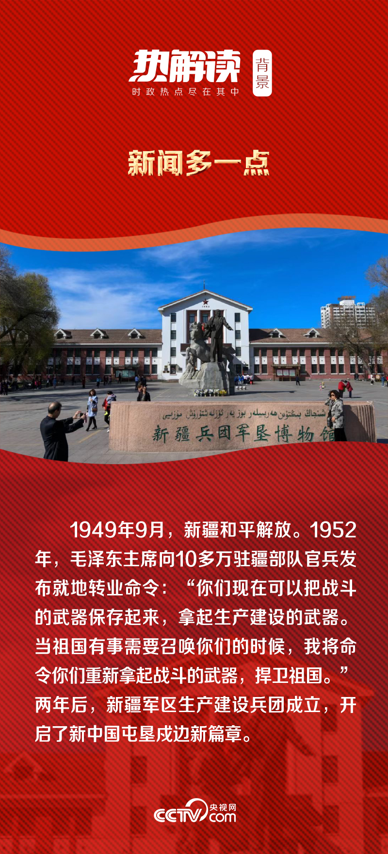 一座展馆,一段历史;一座城市,一种精神。正如总书记在新疆生产建设兵团八师一四三团花园镇广场所说:“兵团的战略作用不可替代。要加快推进兵团改革,深化兵地融合,打造城乡和谐的田园式家园,充分发挥兵团作为安边固疆稳定器、凝聚各族群众大熔炉、发展先进生产力和先进文化示范区的功能和作用,努力形成新时代兵团维稳戍边新优势。”