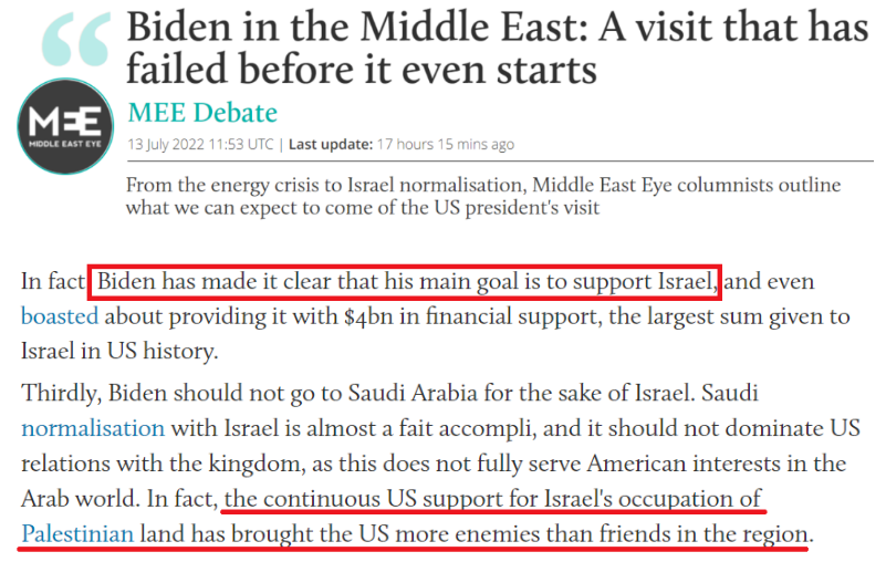 英国“中东眼”新闻网:拜登明确表示,他此访的主要目标是支持以色列。