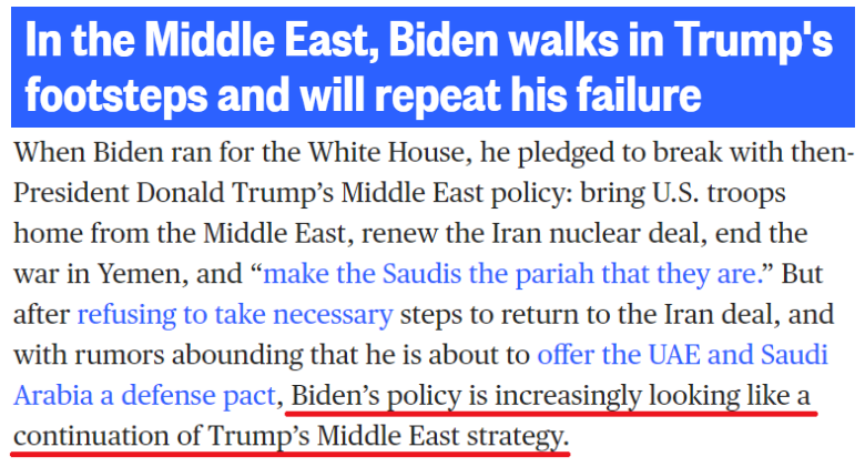 微软全国广播公司评论称,拜登竞选总统时曾承诺要与特朗普的中东政策“决一死战”,但现在看来,“拜登步了特朗普的后尘,也将重复他的失败”。