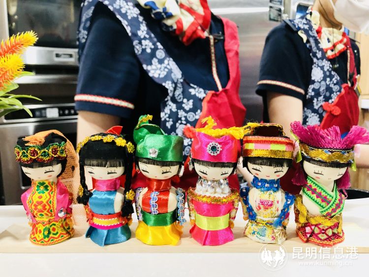 记者看到,以“竹语走廊”为主题的4号餐车车窗上贴有云南少数民族的剪纸,有白族、布朗族、傈僳族、德昂族等保山13个世居民族的人物形象窗花。“簸箕”形状挂饰上,一只孔雀开屏,色彩鲜艳,下方放置一排身着各民族服饰的人偶,极具民族特色。