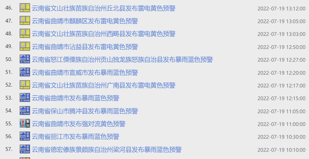 截至19日下午5点45分,云南各地已发布57条预警信息: