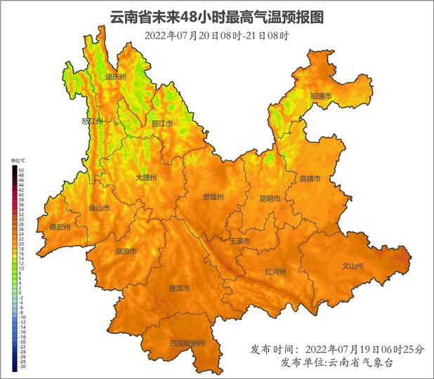 降雨使云南大部地区气温下降,但元江河谷局部地区(新平、元江、元阳、河口)会出现高温天气,公众请注意防暑降温。