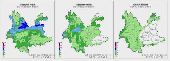 昭通南部、曲靖北部和东部、昆明北部、楚雄北部、丽江大部、怒江、大理中部、保山、德宏西部阴有大雨局部暴雨、大暴雨,其它地区阴天间多云有小到中雨局部大雨。