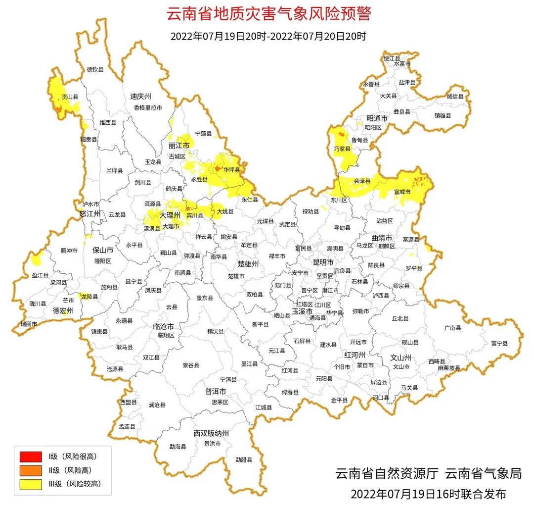 预计:7月19日20:00~07月20日20:00,昭通西南部、曲靖东北部、怒江西北部、丽江东南部、大理中部局地发生滑坡泥石流的风险高;昭通南部、曲靖北部、昆明东北部、楚雄西北部、丽江中部和东部、大理中部、怒江北部、德宏西部、保山局部区域发生滑坡泥石流的风险较高。(春城晚报-开屏新闻 综合云南气象、昆明气象、中国天气网、朋友圈、微博)