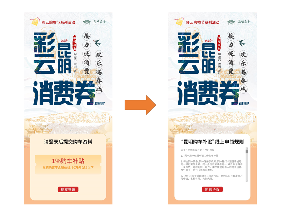5.购车消费者授权登录“昆明市补贴专区”,认真阅读“昆明购车补贴线上”申领规则,并点击同意(参照图例2,以云闪付App实际为准)。