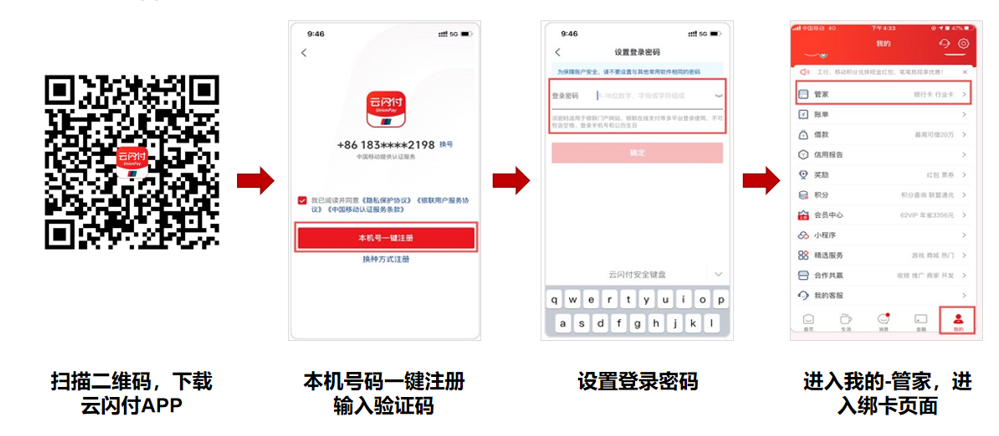 云闪付App下载及绑定银行储蓄卡流程(参照图例4~图例5)。