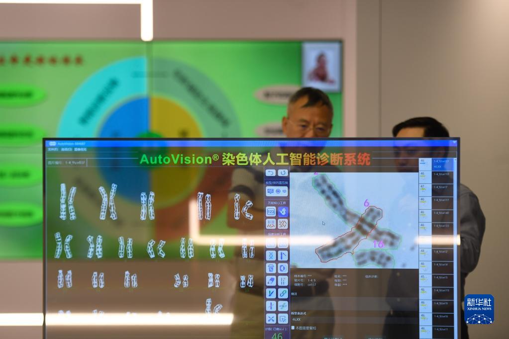 参加中国(杭州)数字·健康小镇开园仪式的嘉宾在小镇的成果转化区了解一套染色体人工智能诊断系统(2020年8月30日摄)。新华社记者 黄宗治/摄
