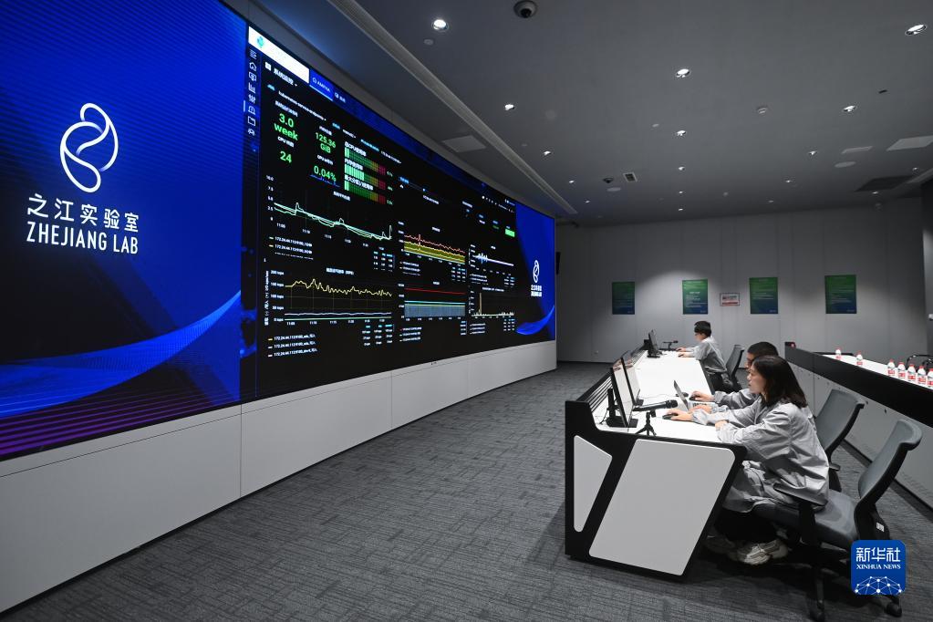 在之江实验室计算与数据中心,工程师们通过“之江云”系统监测服务器集群的运行状态(2022年6月23日摄)。新华社记者 黄宗治/摄