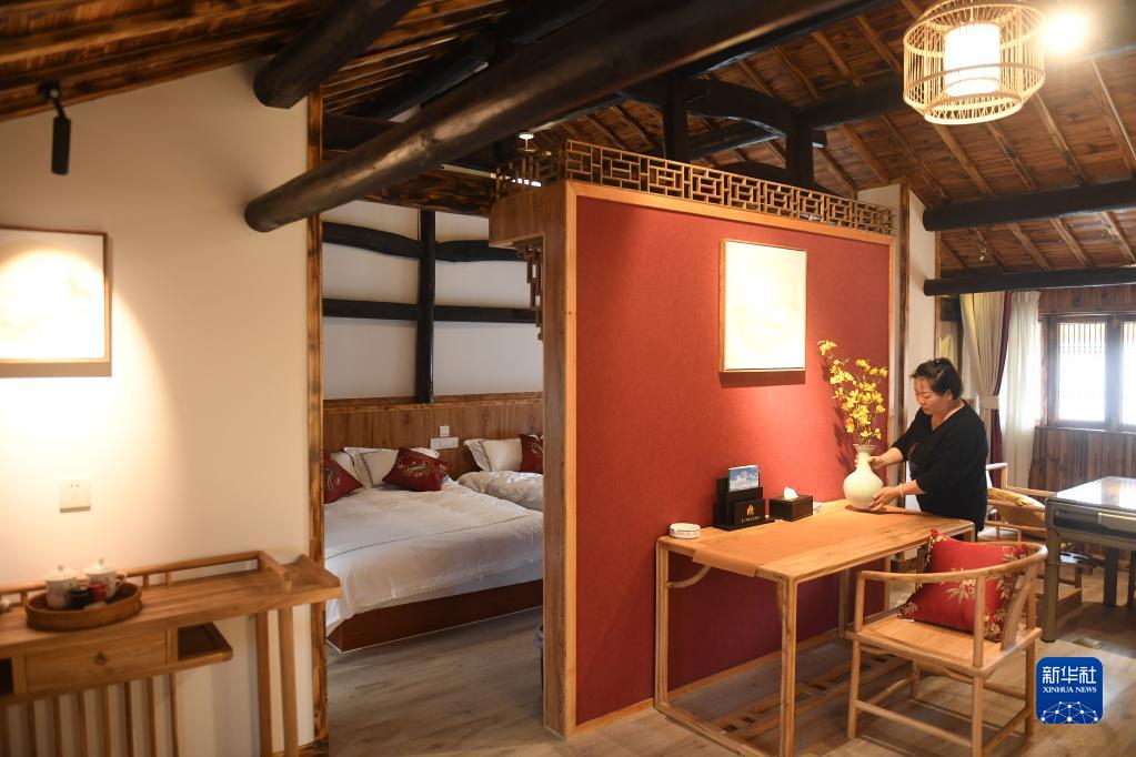 服务员在浙江省磐安县乌石村一家民宿内整理房间(2019年4月24日摄)。新华社记者 翁忻旸/摄