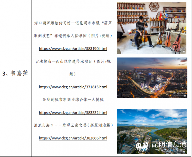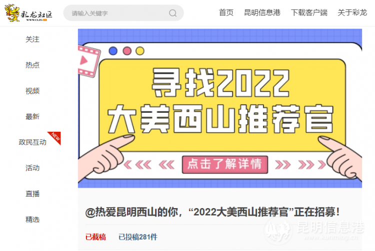 据悉,此次招募活动在全网进行,其中主要依托昆明信息港彩龙社区平台(活动征集帖:https://www.clzg.cn/activity/505.html)开展。截止活动结束,短短二十多天内,全网阅读量约200万,网友互动点赞及评论上千次,有效投稿作品273组,其中图片作品122组,视频作品151个。推荐官作品聚焦昆明西山睡美人、大观公园、草海隧道湿地公园、采莲河、金马碧鸡坊、海口林场、书林街、云纺文创园、西山万达双塔等辖区内多个地标。