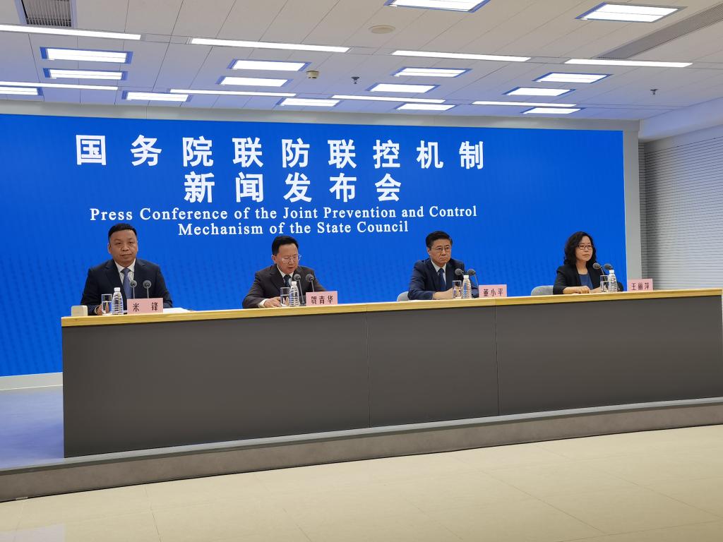 国务院联防联控机制新闻发布会现场。(新华社记者 宋晨/摄)