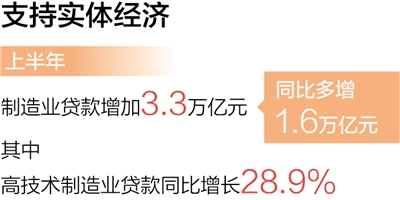 上半年制造业贷款增加3.3万亿元,同比多增1.6万亿元,其中高技术制造业贷款同比增长28.9%。21家主要银行绿色信贷余额18.6万亿元。