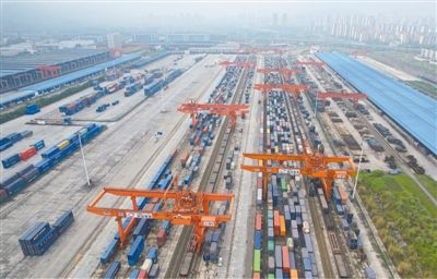 4月2日,重庆团结村中心站,站内正在进行装卸集装箱作业。