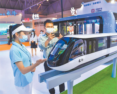 图为观众在西洽会璧山展区参观“云巴”模型。