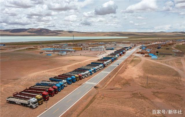 在双湖县多玛乡拍摄的负责运送搬迁群众家具的货车(7月12日摄,无人机照片)。新华社记者 孙非 摄