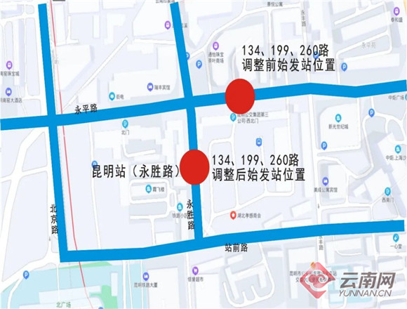 调整前,134路、199路、260路等三条公交线路在昆明站的始发站位于永平路,该位置为临时上下客停车点。