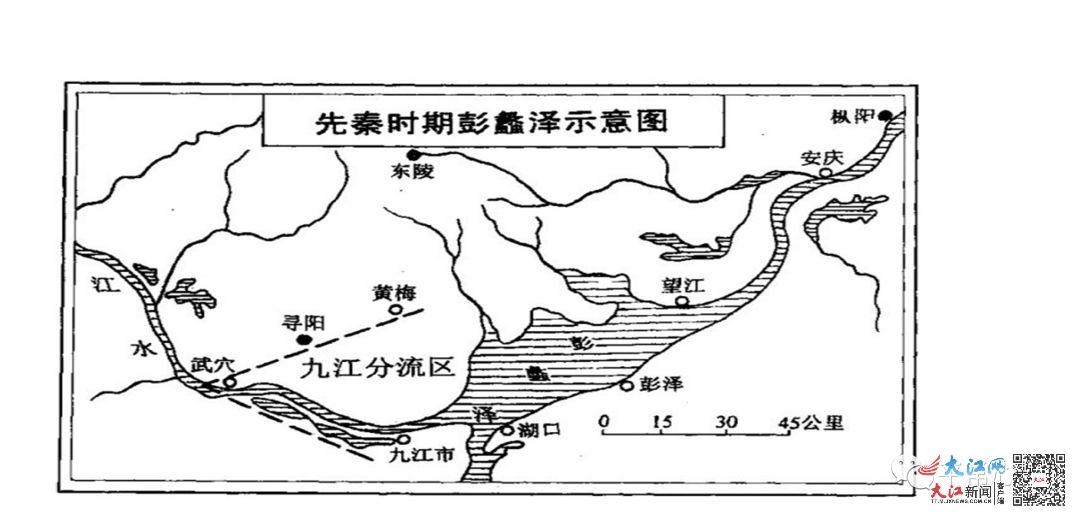 冰期过后,气候变暖,海平面慢慢上升,对长江的水产生顶托,长江河床的溯流侵蚀停止,长江和鄱阳湖盆的高差逐渐减少。距今6300年属于全新纪最温暖时期,雨量充沛。古长江出了武穴后,就分散为众多的游荡型中小河流,北至黄梅城关、南至现今九江市形成一个巨大的扇形三角洲,尚未形成主泓道,呈现沼泽地貌。后来人称彭蠡古泽。九江就跟这里有关,毛主席词“云横九派浮黄鹤,浪下三吴起白烟”中的“九派”就指这一带形成的彭蠡古泽。请看彭蠡古泽图(谭其骧、张修桂,1982):