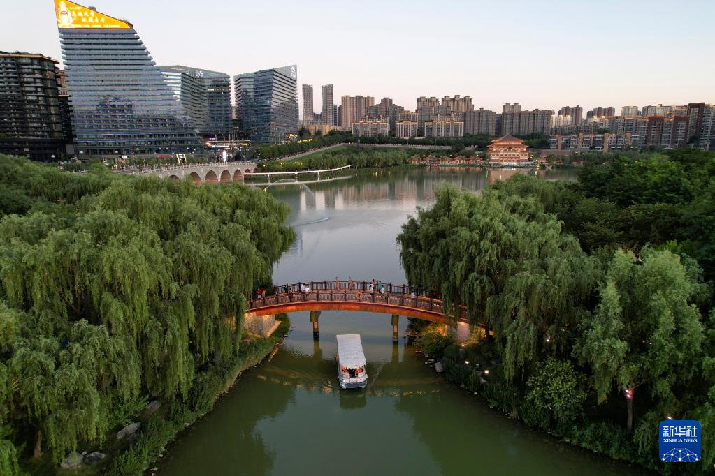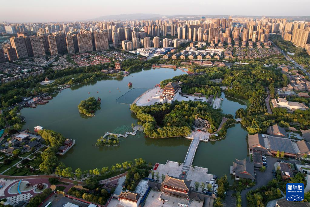 西安曲江池遗址公园一景(2022年6月14日摄,无人机照片)。