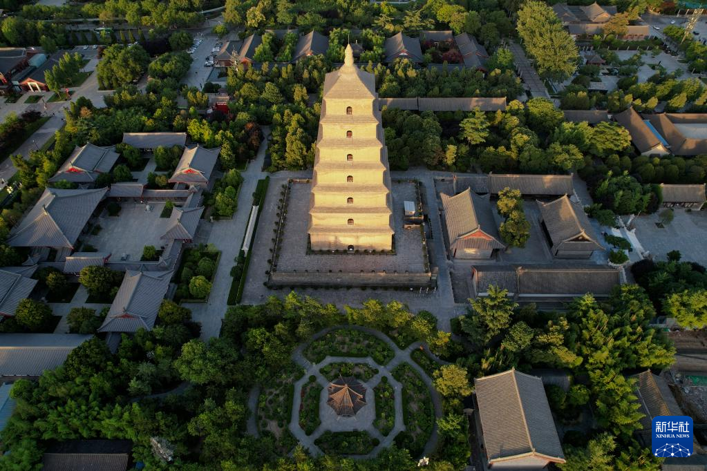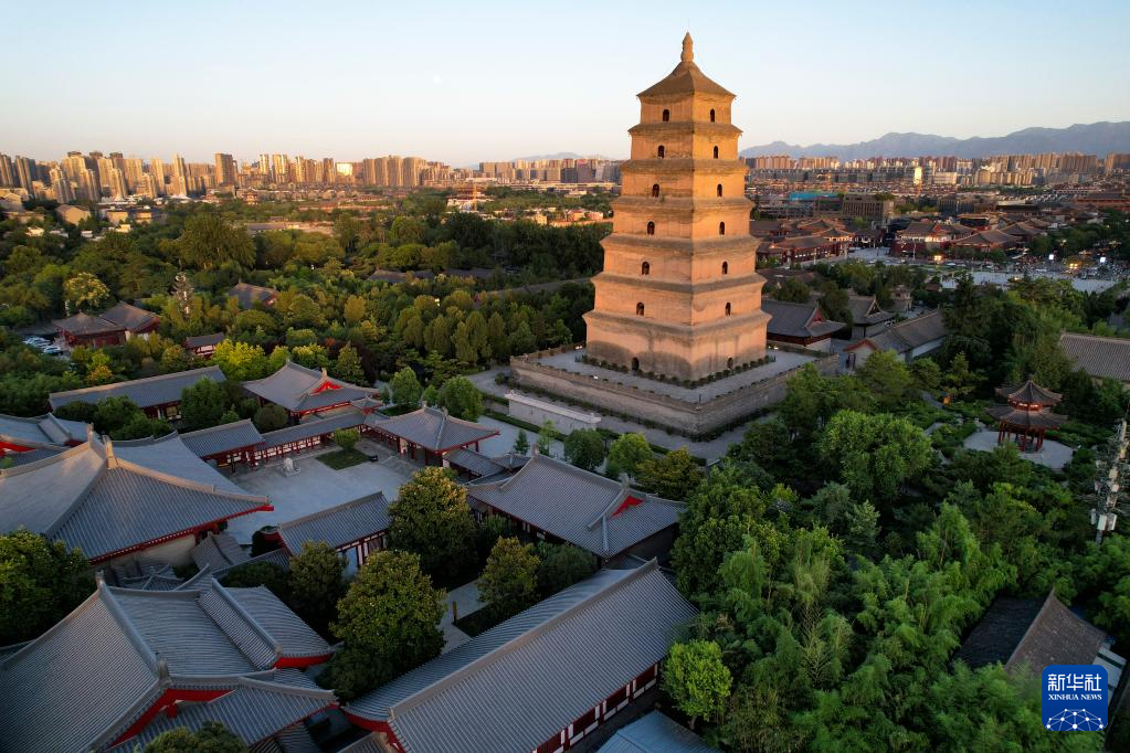 日落时分的西安大雁塔景区(2022年6月13日摄,无人机照片)。