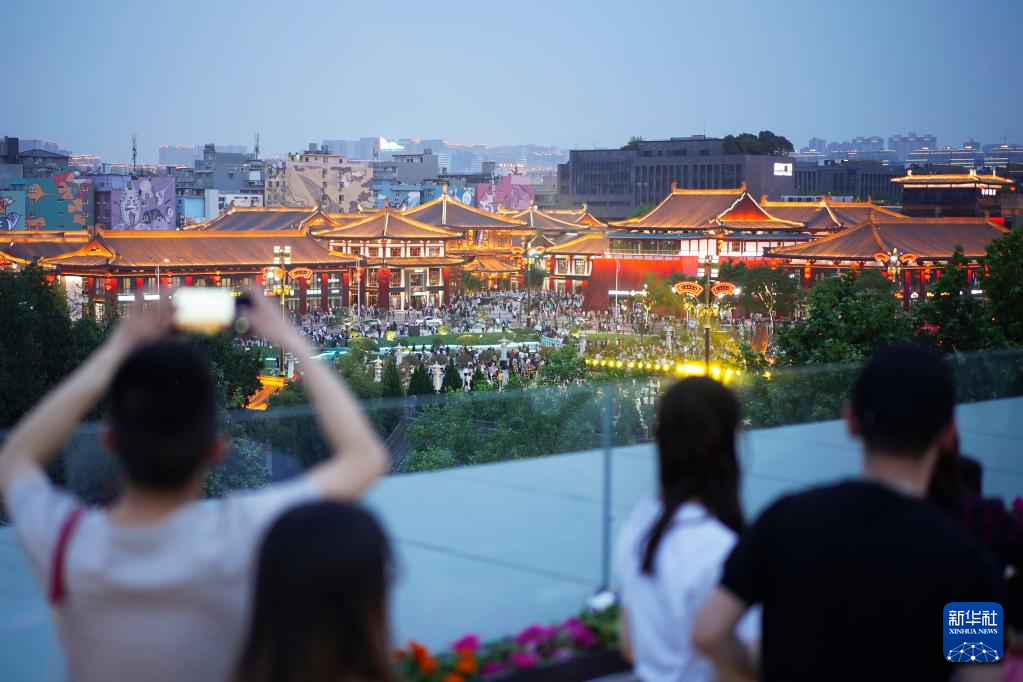 游客在西安曲江新区内的长安十二时辰主题街区内游览(5月19日摄)。