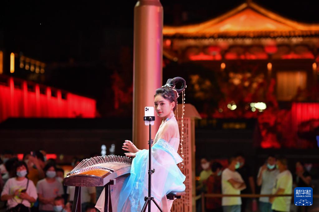 7月18日,演员在西安大唐不夜城演奏乐器。