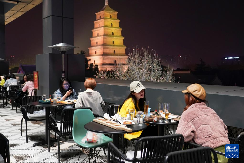 顾客在西安大雁塔景区一家餐厅的露台上用餐(2020年3月23日摄)。