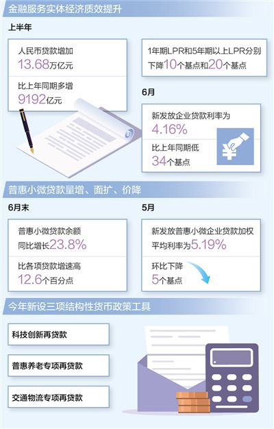 数据显示,上半年,我国社会融资规模增量为21万亿元,同比多增3.2万亿元,人民币贷款增加13.68万亿元,比上年同期多增9192亿元。与此同时,央行持续释放贷款市场报价利率(LPR)改革潜力,1年期LPR和5年期以上LPR分别下降10个基点和20个基点,6月份新发放企业贷款利率为4.16%,比上年同期低34个基点,企业综合融资成本稳中有降,金融服务实体经济的质量和效率明显提升。