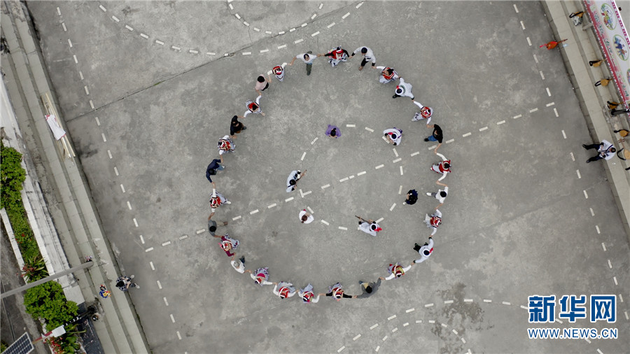 航拍福贡县腊竹底村村民排练傈僳族舞蹈。新华网 李浩 摄