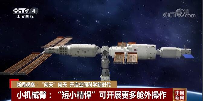 在问天实验舱的气闸舱外还有一套5米长的小机械臂。这套7自由度的机械臂小巧、精度高,操作更为精细。未来,小臂还可以与核心舱大臂组成15米长的组合臂,在空间站三舱组合体开展更多舱外操作。