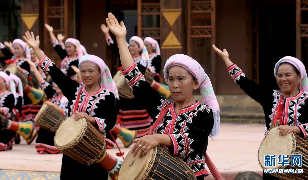 班利村群众表演队在表演拉祜族鼓舞。新华网发(张家杰 摄)
