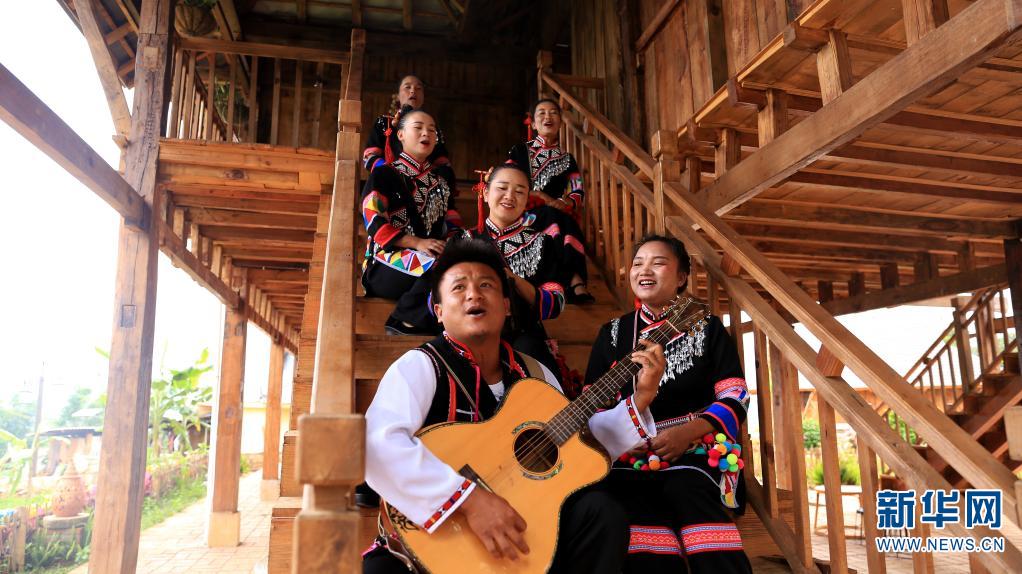班利村群众表演队在演唱《最美丽的拉祜山》。新华网 李浩 摄