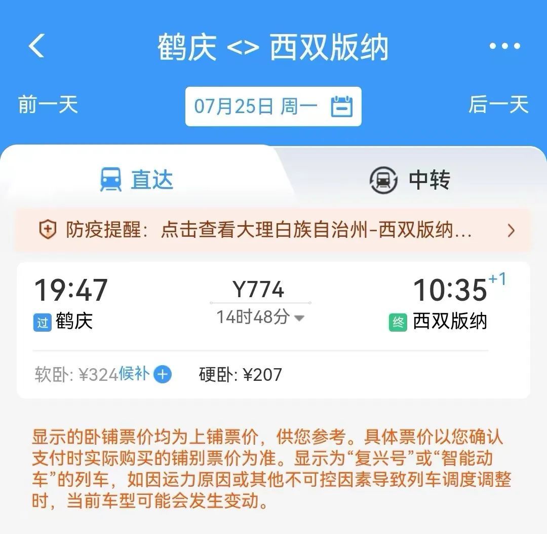 丽江的发车时间为18:57分,次日10:35分到达西双版纳;从西双版纳出发的时为19:40分,次日10点24分到达丽江。途经鹤庆、昆明、普洱。