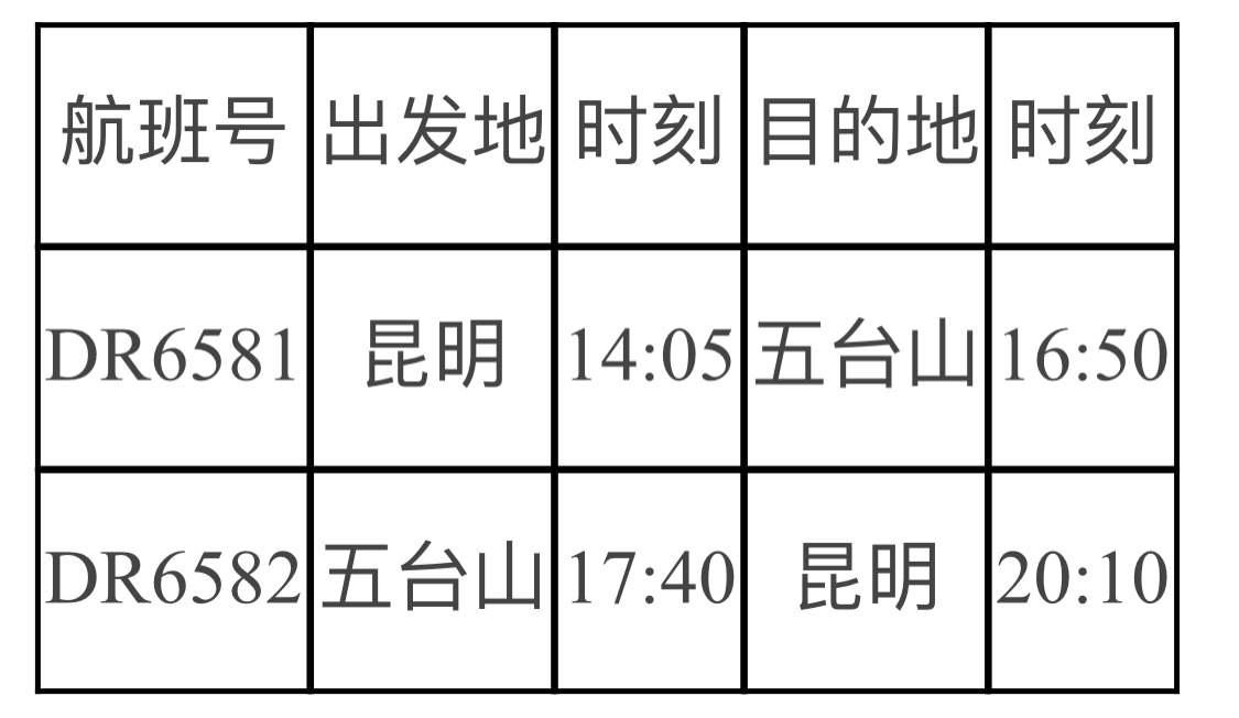 “昆明=五台山”航班班期计划为每周二、四、六执飞,航班信息如下: