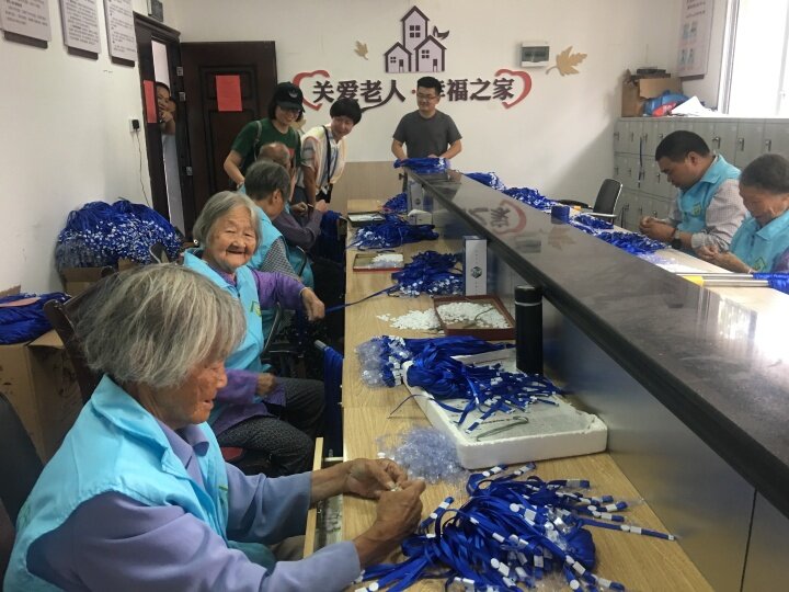 室外烈日炎炎,开着空调的泰顺县司前畲族镇养老服务中心里满屋清凉。吃完午饭后,4位老人已在活动室开始了中心接来的来料加工手工活:给小扣子穿上挂绳。76岁的钟阿婆决定先好好午休,然后再到活动室里看看——在这个没有规定上下班时间,没有要求工作时长,干不干、干多少全凭心情的“小车间”里,钟阿婆等20多位由中心配餐的老人,闲不住的时间如果顺手做做手工活,一个月大概能拿到两三百块钱的“零用钱”,扣除中心每月配餐的260元-300元的费用后,还会小有盈余。