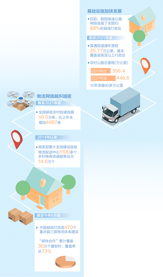 近年来,我国“通道+枢纽+网络”物流运行体系建设持续推进,重大物流基础设施加快建设,国家骨干流通网络逐步健全。日前发布的《2021年邮政行业发展统计公报》指出,全国邮政农村投递线路10.5万条,比上年末增加4097条;农村投递路线长度(单程)415.5万公里,比上年末增加5.1万公里。