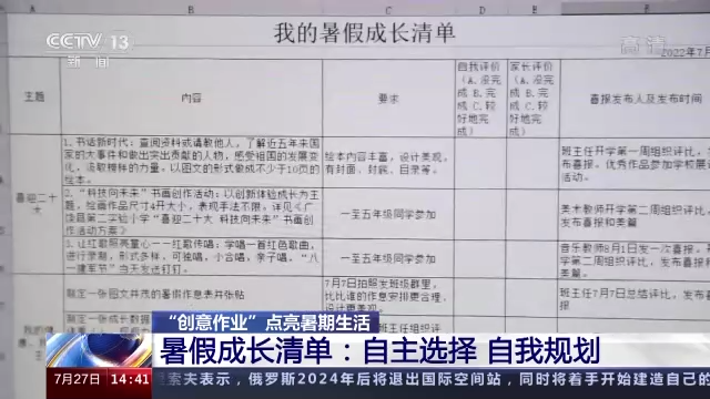 在山东、江苏等地的部分中小学,学校专门为同学们制定了一份“暑假成长清单”,不仅内容丰富、科学,也给了同学们自主选择、自我规划的空间。