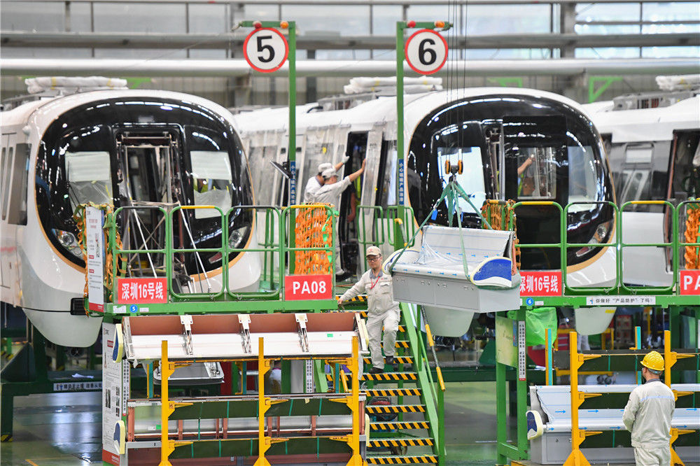 在位于湖南省株洲市石峰区的中车株洲电力机车有限公司城轨事业部总成车间,工人在生产线上作业(2022年7月5日摄)。新华社记者 陈泽国 摄