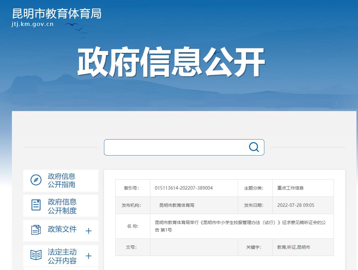 7月28日,昆明市教育体育局发布公告,将对《昆明市中小学生校服管理办法(试行)》(征求意见稿)是否适当,听取社会各方面的意见和建议,听证会拟定于2022年8月11日(星期四)下午14:30举行。《昆明市中小学生校服管理办法(试行)》(征求意见稿)也同时发布,适用于昆明市各级各类公办学校(含中职学校)的校服管理工作,各类幼儿园及民办学校参照执行。