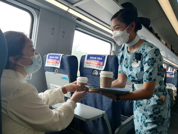7月27日,列车员依波逢为旅客递上一杯咖啡。新华网记者 侯强 摄