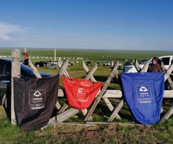 7月18日,呼伦贝尔市新巴尔虎右旗克尔伦苏木蒙古包前,一组三色分类垃圾袋迎风飘扬,在巾帼力量的监督引领下,广袤草原也有了垃圾分类,绿色草原得以实现垃圾无害化、减量化。