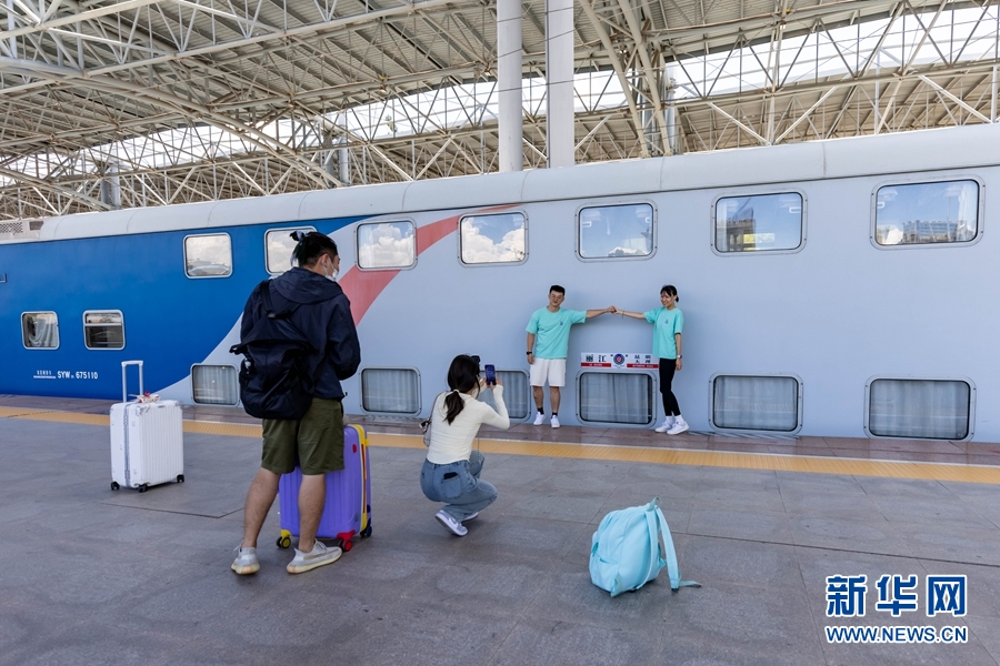 游客在双层旅游列车外留影(摄于7月20日)。新华网发(徐章位/摄)