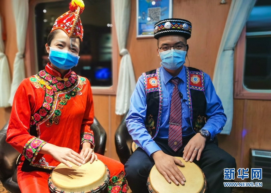 列车工作人员正在进行文艺表演(摄于7月20日)。新华网发(蒋志飞/摄)