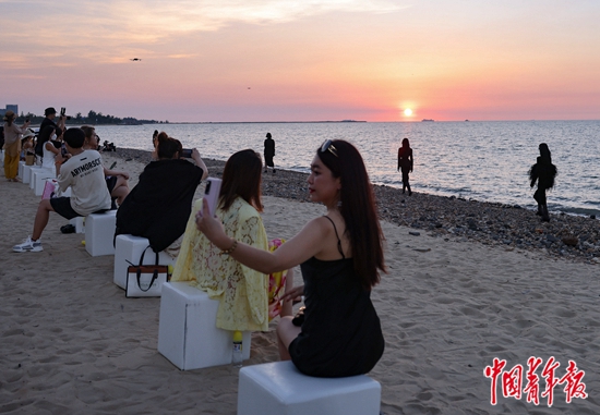 7月27日,海南海口的一片沙滩上,一排模特在大海的映衬下,用猫步扬起细沙,场边不少观众将这一幕纳入了自拍背景中。这里是第二届中国国际消费品博览会时装周的海边秀场,模特与观众在落日余晖下共同沉浸在美好氛围中。设有室内、海边双秀场的时装周,是本次消博会的重要活动之一,参展的大多数是女装品牌。