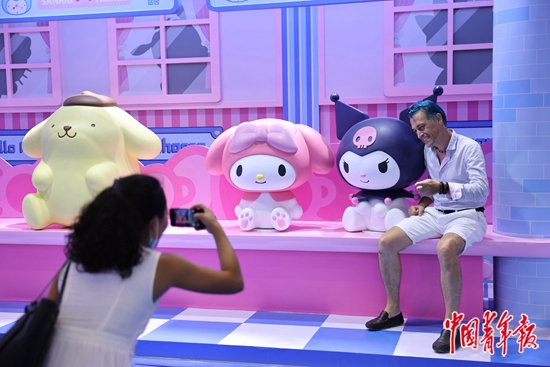 7月25日,海南海口,第二届中国国际消费品博览会服务消费展区内,外国参观者与三丽鸥展位的卡通形象展品合影。许多人认为,女性消费能力提升是卡通形象IP流行的原因之一。